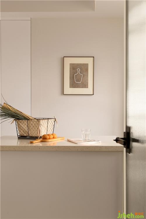 緊鄰餐桌的位置定制了奶咖色的島臺(tái),延伸的臺(tái)面可以充當(dāng)餐桌,備餐端菜,一氣呵成。用餐之余,還能夠作為吧臺(tái)、工作臺(tái)使用,營(yíng)造出溫馨活潑的家居氛圍。墻面搭配一幅藝術(shù)掛畫,帶來生活上的一份小美好。