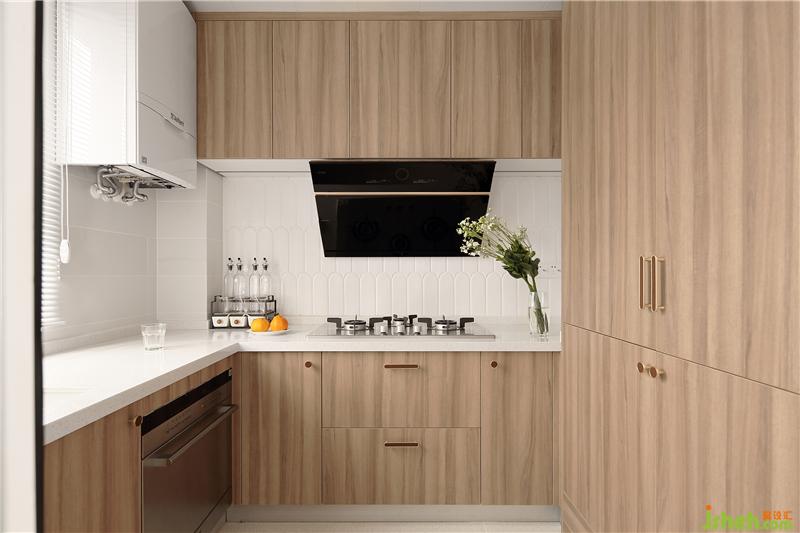 廚房以原木+白色為主調(diào),清新自然,放松靜謐。冰箱做了嵌入式,使得空間更加美觀整潔。