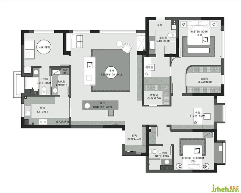 8.客廳與主臥之間的墻體整體優(yōu)化,分別設計了公共的衣帽間和化妝間
