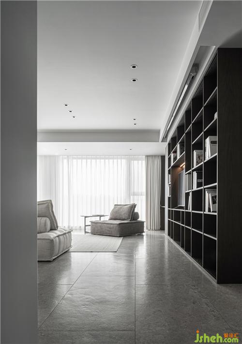 6.客廳通往書房的墻體拆除,設計了一處開放式的書房