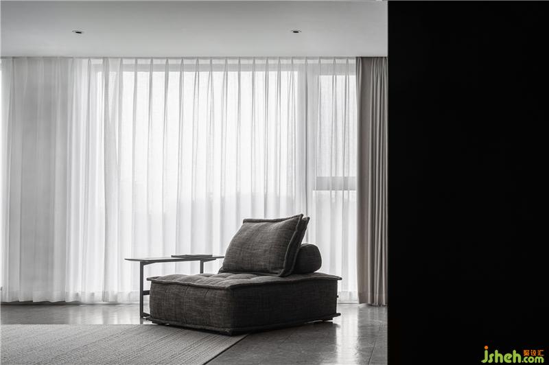 客廳的沙發(fā)由三塊可移動的單人沙發(fā)所組成,可隨心意擺放在任一角落,半躺的設計有助于壓力的釋放,在這寬廣的客廳空間中最適合不過了,灰色與米色的搭配也更顯高級感。地上鋪上一塊淺色的棉麻地毯,帶來一份溫潤與清新。