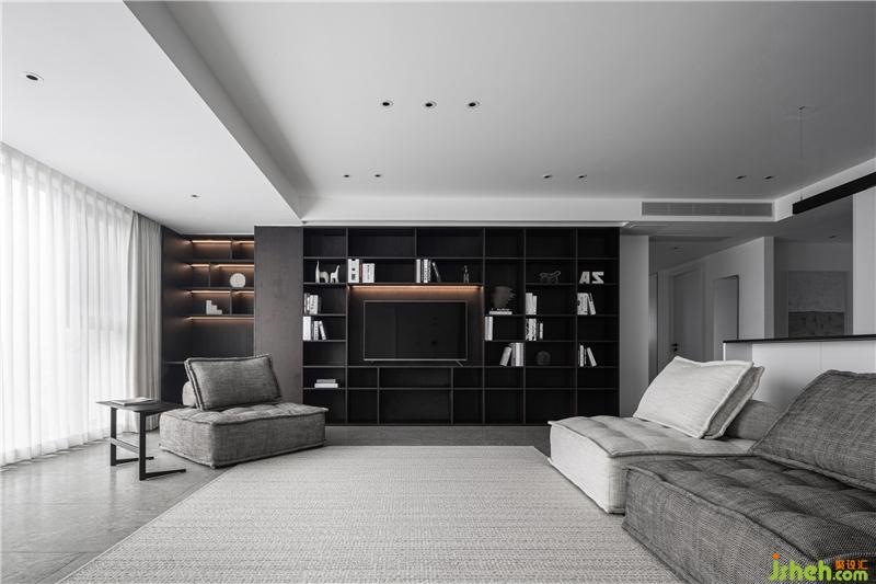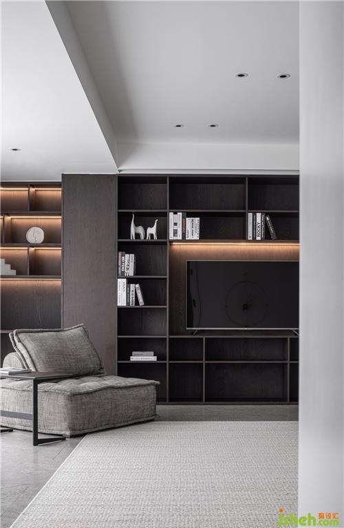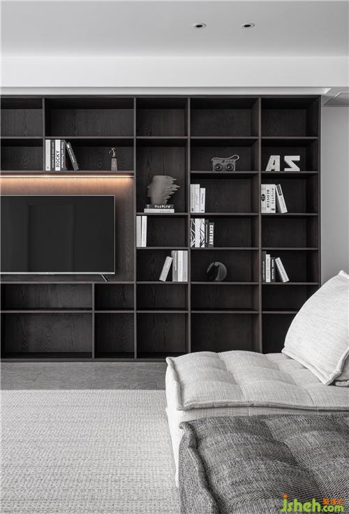 整面的開放式書柜,滿足了屋主愛看書的習慣。將電視內(nèi)嵌于其中,滿足多種功能需求。
