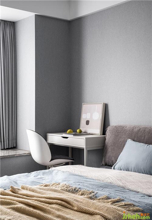 次臥在灰白的色調(diào)下點(diǎn)綴淡藍(lán)色,以簡約的設(shè)計(jì)手法構(gòu)筑純粹的生活情境,靜謐與質(zhì)感的格調(diào)氤氳而生。