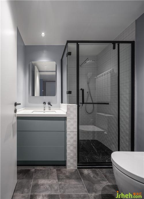 鋪滿白色小方磚的半矮墻和透明玻璃將干濕區(qū)域做了分隔,淋浴、馬桶和洗漱臺功能劃分明確,整體給人一種自然清爽的感覺,更顯簡約、潔凈。