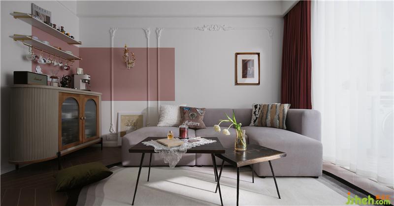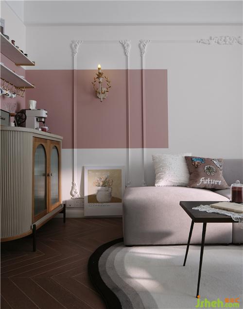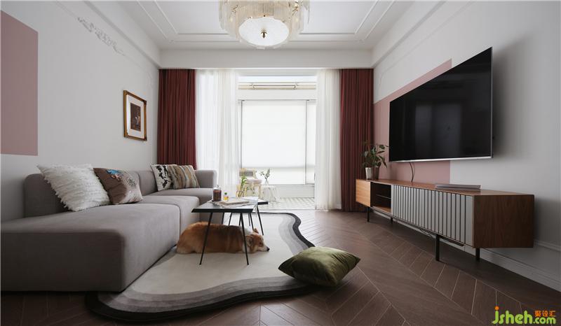 電視墻同樣運用了白色與粉色的撞色設計,與沙發(fā)墻彼此相呼應,清爽利落,使得空間更加洋氣和時髦。電視柜集開放、封閉、收納、展示于一身,營造輕盈的視覺美感,胡桃木的材質也為空間帶來一份溫潤質感。