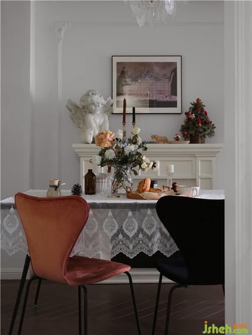浪漫的餐廳空間,鋪上一塊滿繡圖案花型的蕾絲桌布,在水晶燈的配合下,與精美的餐椅交織,南京室內(nèi)設計師協(xié)調(diào)出柔和的用餐氛圍。壁爐一角為靜謐氛圍增添了浪漫氣息,賦予空間更多內(nèi)涵,帶來審美與精神上的雙重享受。