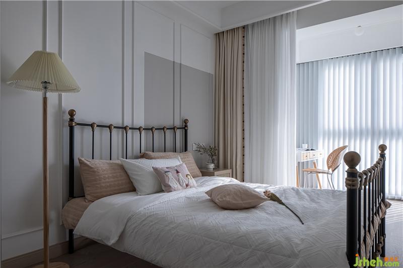 床角搭配一盞米白色的落地?zé)簦Ⅲw式燈罩設(shè)計,凸顯有層次的柔美感,南京室內(nèi)設(shè)計師美而優(yōu)雅。燕麥色的衣柜,與整屋色調(diào)相統(tǒng)一。