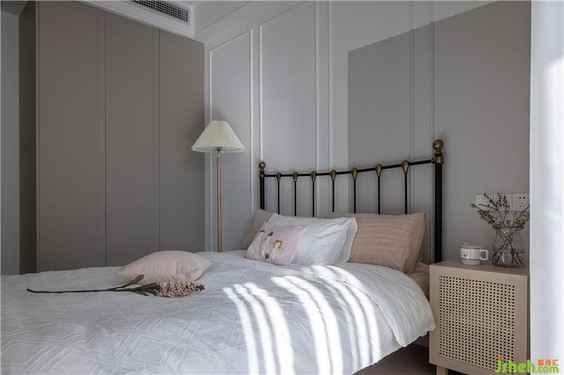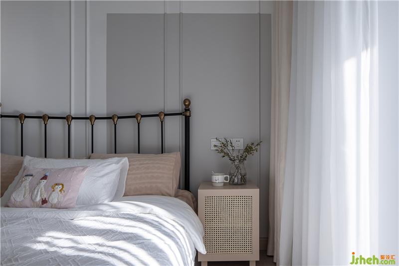 床頭背景墻用簡單的石膏線條作為裝飾,選擇一塊區(qū)域做了白色與灰色的撞色,給靜謐的空間帶來一絲時尚氣息。