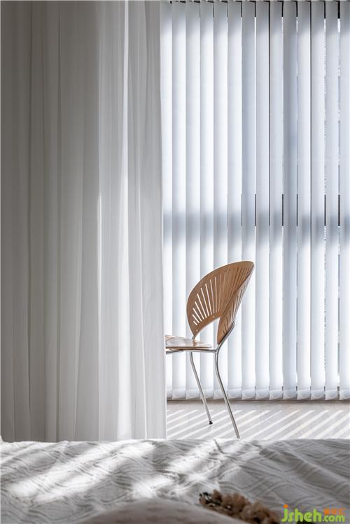 陽臺納入到兒童房的空間,作為孩子的學(xué)習(xí)區(qū)。窗邊定制了豎百葉簾,能夠靈活控制光線的攝入,使得空間看上去更具美感。