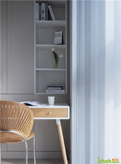 白色+原木色組合而成的書桌,在光線的映襯下,顯得格外的舒適自然。