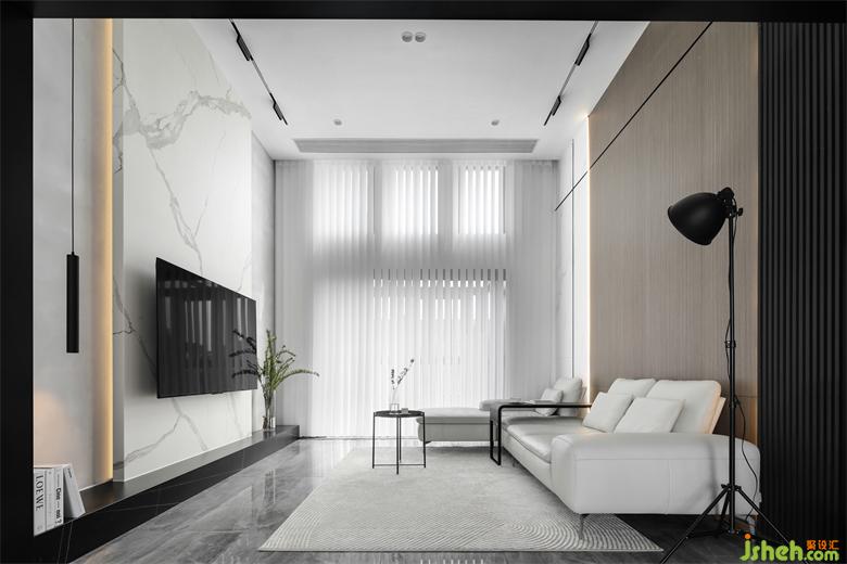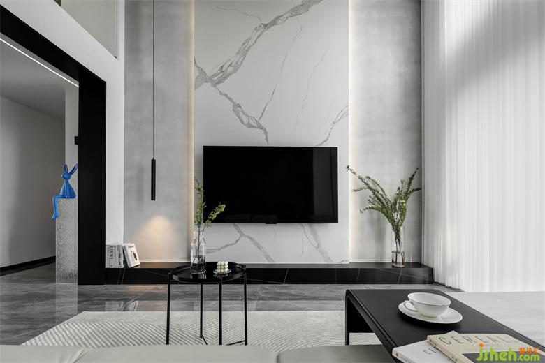電視背景墻通過(guò)白色的巖板貫通到頂,兩側(cè)采用淺灰色的微水泥做襯托,清新淡雅,使得客廳在縱向上拉長(zhǎng),流動(dòng)的自然紋理增加了空間的視覺(jué)延伸感,南京裝修設(shè)計(jì)提升了空間的顏值和氣質(zhì)。底部與石材地臺(tái)相銜接,黑色與自然紋理的結(jié)合,渲染出靜謐深邃的氛圍,上面可以擺放裝飾品、書(shū)籍等,提升空間的藝術(shù)品味。