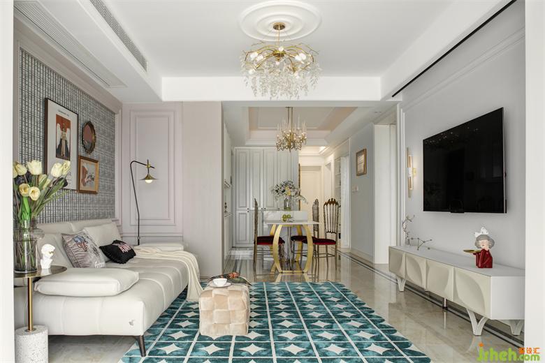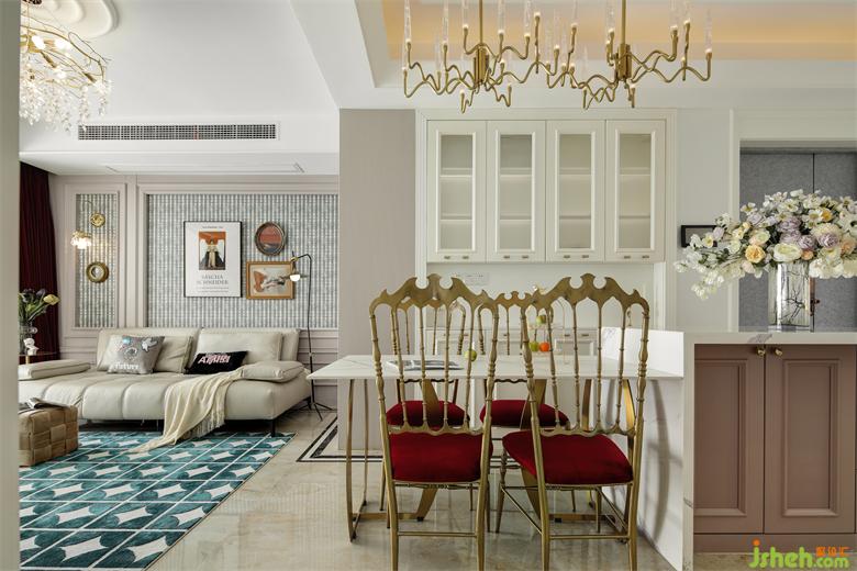 客廳頂部采用石膏扥盤與輕法式線條設計,搭配金色的法式水晶吊燈,呈現(xiàn)出夢幻般的光照效果,傳達出法式特有的內(nèi)斂與風情。南京公館設計地面鋪上一塊由綠白色塊組成的地毯,與整體軟裝相呼應,席地而坐、和朋友聚會,增加更多休閑空間,也為屋內(nèi)增添了超高的顏值。