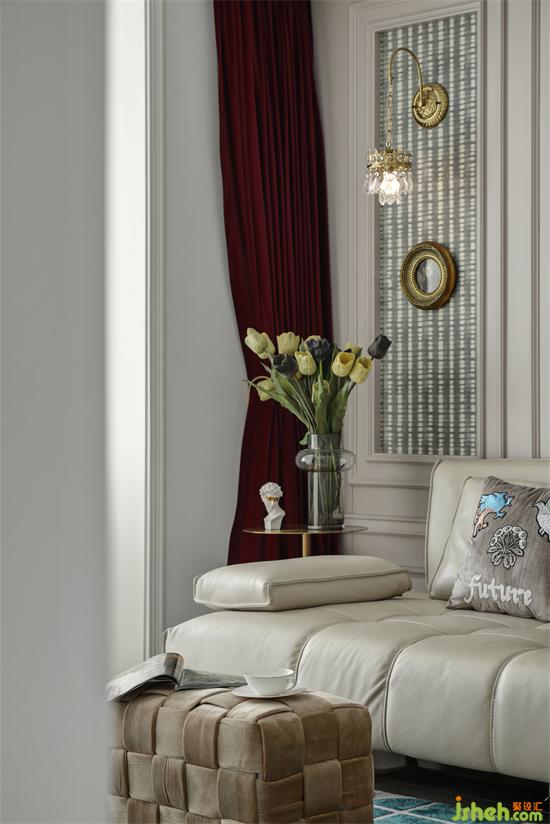 沙發(fā)墻一側安裝一款金銅色的高顏值壁燈,瞬間點亮空間的層次,不僅能輔助照明,還能烘托溫馨的氣氛;正下方搭配直徑20cm的圓形裝飾畫,上下呼應,復古中凸顯出一絲奢華,為墻面增添暖暖的情調(diào)。