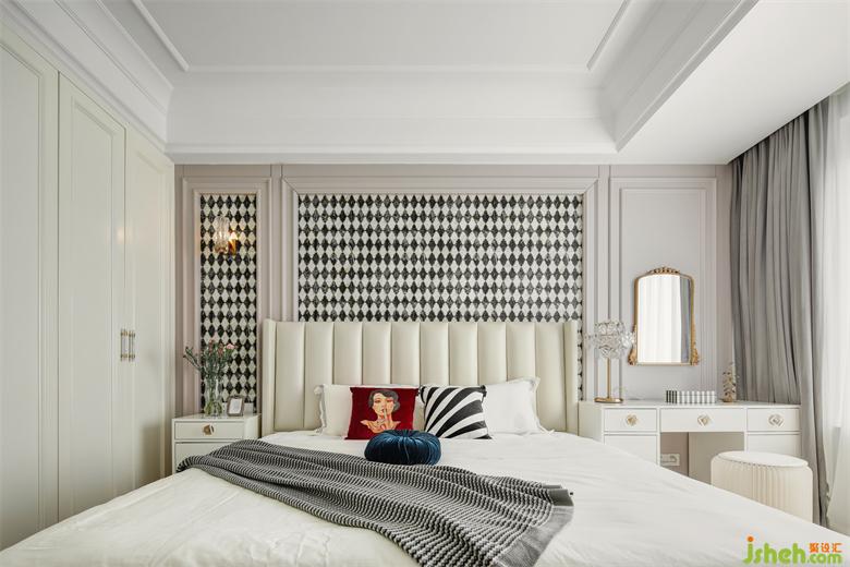 床頭背景墻采用與客廳沙發(fā)墻相同的設計手法,護墻板與墻紙的組合,南京公館設計在復古中體現(xiàn)溫柔的浪漫氣質(zhì)。奶油色的衣柜,契合屋主對顏色統(tǒng)一格調(diào)的喜好,造型、色彩、材質(zhì)上相互匹配,讓空間更柔美。