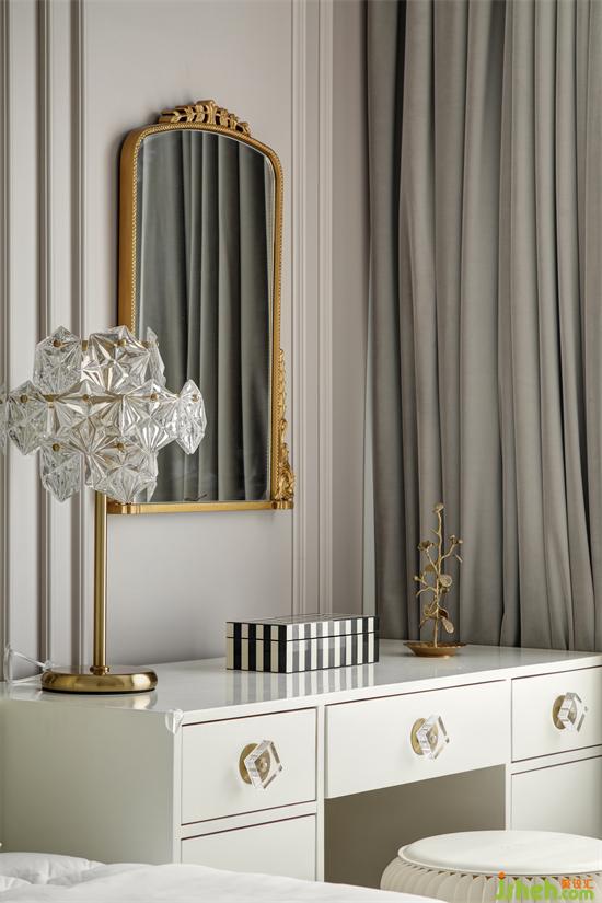 白色的梳妝臺,簡單大方卻不失設計感,擁有超多的儲物空間,南京公館設計配上菱形的水晶拉手,簡約中凸顯質(zhì)感;金色邊框+雕花的化妝鏡,彰顯讓人迷戀的高貴氣質(zhì),提升屋主的藝術品味。六邊形的水晶臺燈,時尚優(yōu)雅的設計,張揚著雅致和前衛(wèi);黑白色的長方形首飾盒+黃銅首飾架的組合,可以滿足不同首飾收納的需求,收納與藝術的結合,輕松放置心愛小物件。