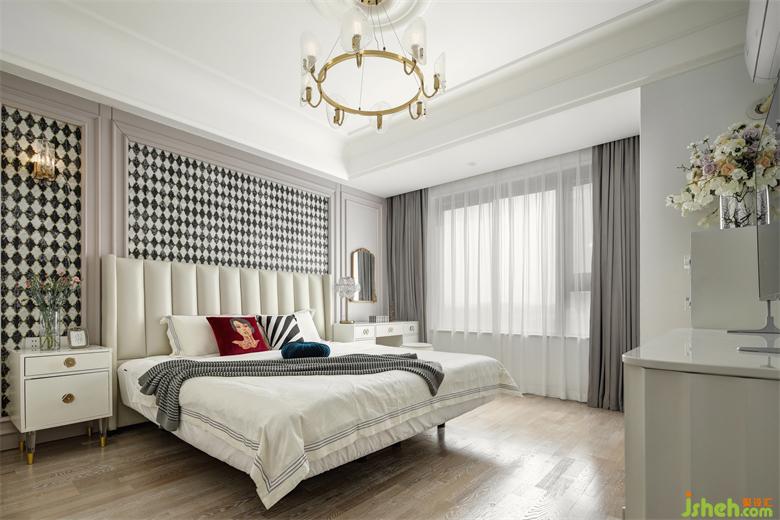 臥室頂部采用與客廳相似的石膏扥盤與輕法式線條設計,搭配玻璃金色吊燈,微光透過玻璃的過濾氤氳成一束浪漫柔光,點亮屋內(nèi)溫馨浪漫的氣息。奶油色的大床,舒適柔軟的床頭靠,呈現(xiàn)出飽滿有型的視覺效果,南京公館設計讓人感受到回歸家庭的愉悅安和。