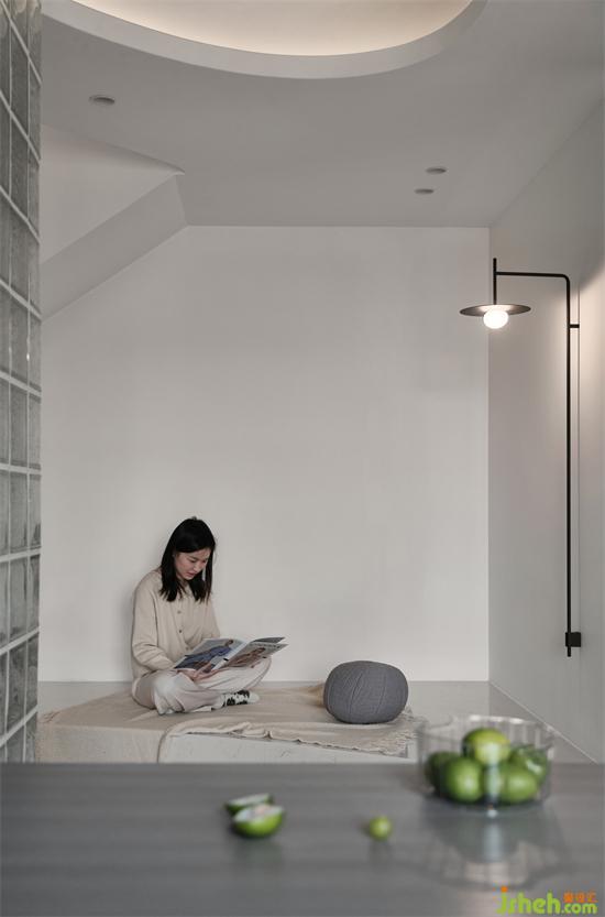 側(cè)墻和頂面梁都涂刷了藍(lán)色,帶來一種寧靜之感,在大面積留白的包裹中,又多了幾分柔和,讓空間盡顯清新和通透。