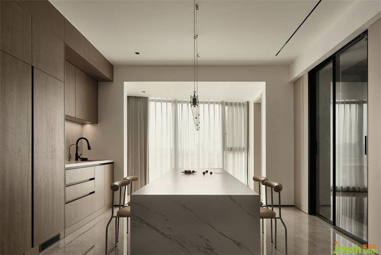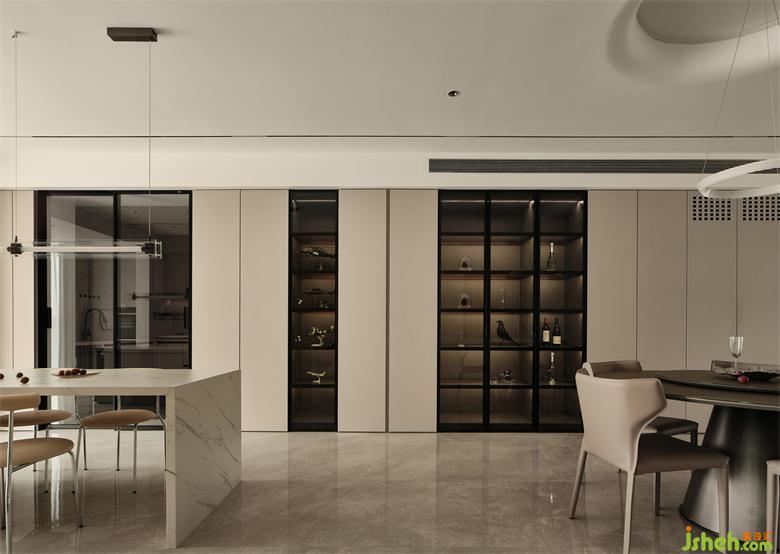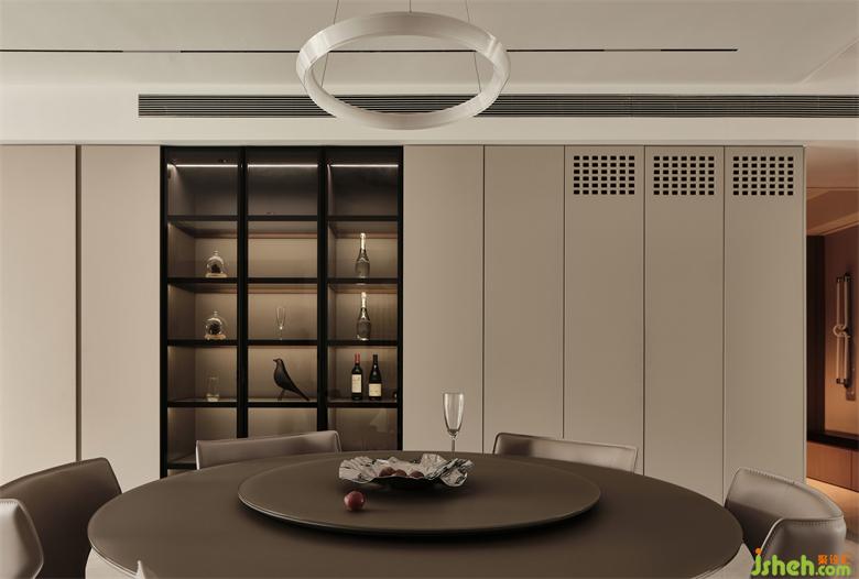 餐邊柜、封閉式柜體與展示儲(chǔ)物柜的組合,展示柜兼具酒柜的功能,展示收納兩不誤,充足的收納儲(chǔ)物空間,保持了空間的簡(jiǎn)潔與實(shí)用。