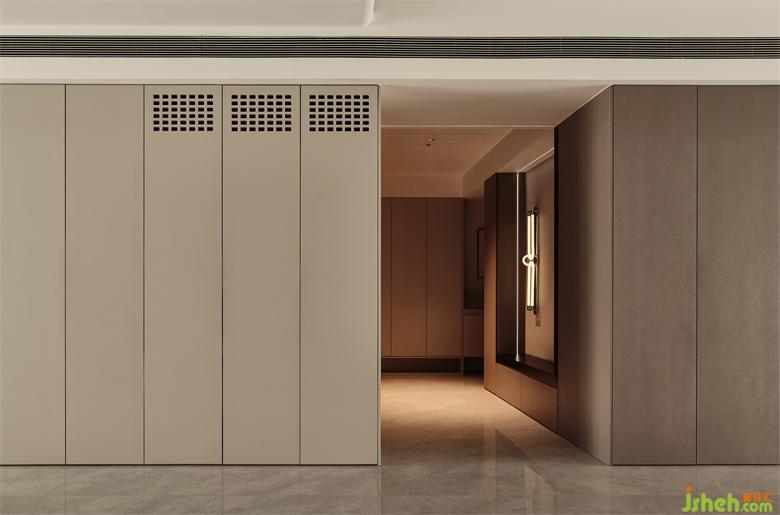 玄關(guān)左側(cè)定制了一組頂天立地的儲(chǔ)物柜,大大滿足了收納所需,底部留空一層,方便放置當(dāng)季的鞋子;整面的暖灰色顯得更加清爽潔凈,帶來(lái)一份平靜的舒適感。