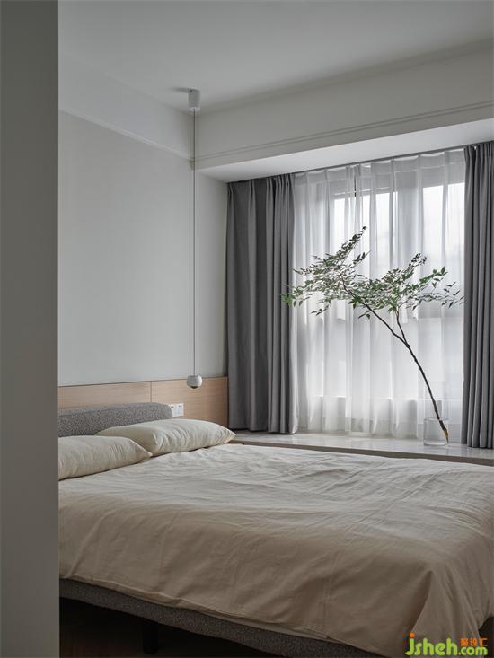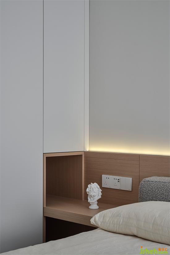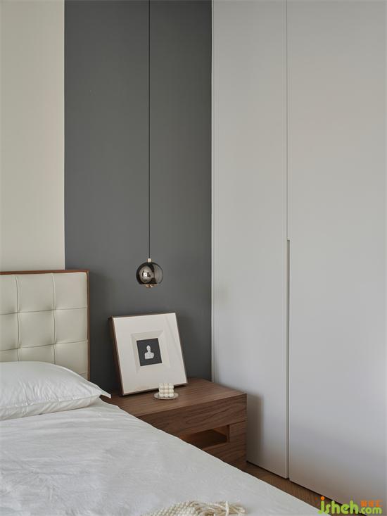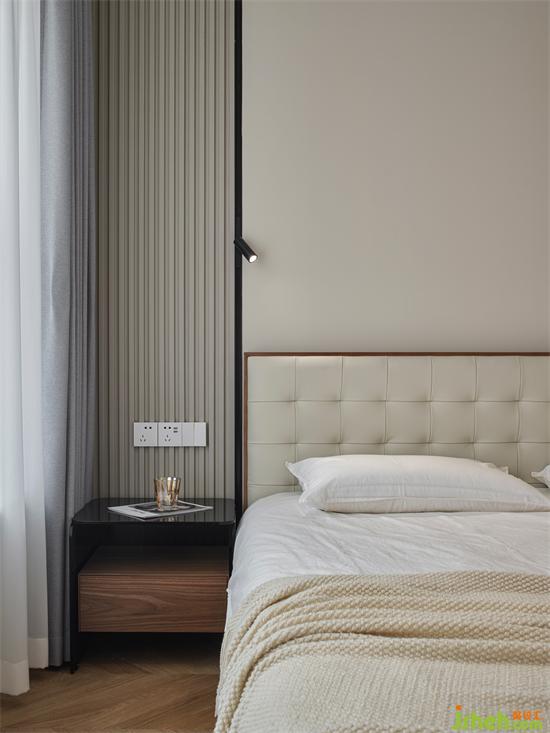 主臥在現(xiàn)代的基礎(chǔ)上,選擇了成熟穩(wěn)健的配色,床頭背景墻采用米白色+深灰色的撞色組合,搭配整排的白色衣柜,整體呈現(xiàn)寧靜和諧的氛圍;一側(cè)利用木色的格柵做裝飾,增加視覺上的層次感,簡約中更顯溫潤和設(shè)計(jì)感。南京瓏玥名邸精裝房改造購置米白色的軟包床,松軟的靠背讓倚靠更愜意,帶來滿滿的安全感。
