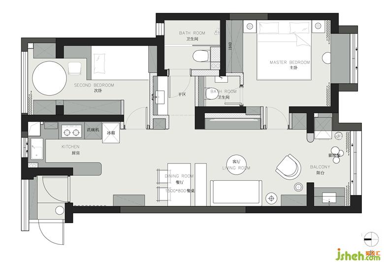 3. 南臥室的進(jìn)門位置調(diào)整至客廳一側(cè),在臥室內(nèi)設(shè)計(jì)一間小的衛(wèi)生間,滿足馬桶和洗漱功能,減少同時(shí)使用衛(wèi)生間的麻煩;