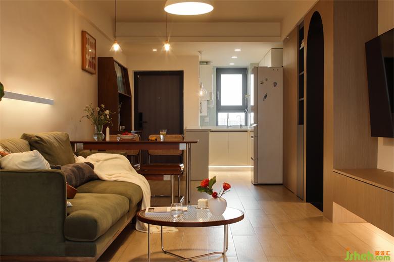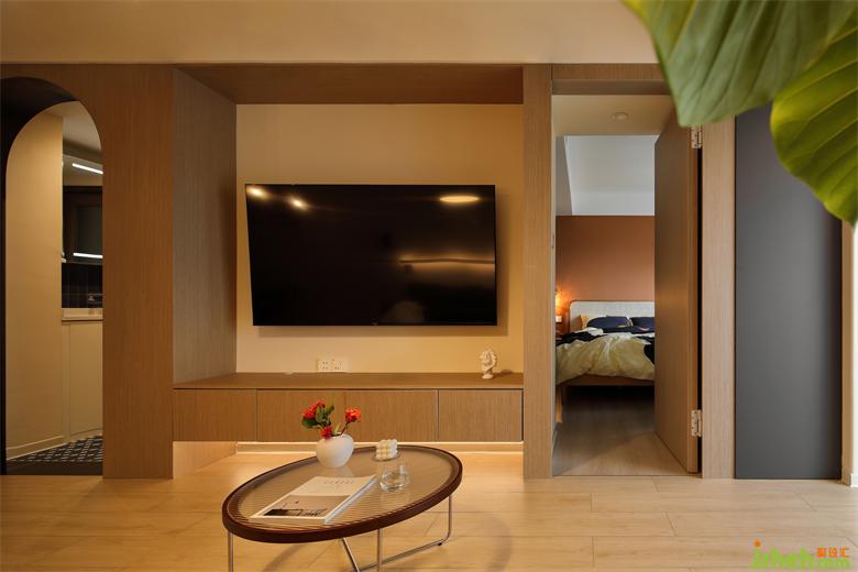電視背景墻的四周用原木色的木飾面打造,讓奶白色的墻面多了一絲溫潤(rùn)感和自然。電視柜采用了懸空的設(shè)計(jì),不占空間,還避免了衛(wèi)生死角,將電視柜與兩側(cè)木飾面結(jié)合在一起,起到了裝飾的整體性;上方留了兩個(gè)明裝插座,方便各種多功能小電器的使用;下方加入燈帶,塑造了空間的層次感與精致感?;榉吭O(shè)計(jì)通往次衛(wèi)的門洞設(shè)計(jì)了拱形,劃分出獨(dú)立的兩個(gè)區(qū)域,柔化空間的視覺(jué)效果,提升了整屋的顏值和藝術(shù)氣質(zhì)。