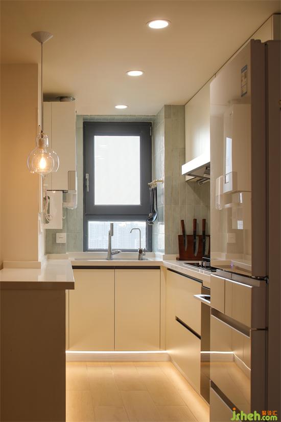 為了提升廚房的體驗(yàn)感,廚房設(shè)計(jì)了開(kāi)放式,少了門與墻的隔斷,動(dòng)線更流暢舒適,操作起來(lái)也更加寬敞。吊頂采用石膏板吊頂,內(nèi)嵌三個(gè)筒燈,與餐廳之間的銜接更加和諧美觀。家裝設(shè)計(jì)墻面鋪貼了淺藍(lán)色的復(fù)古磚,自帶漸變色;地面由客餐廳延伸進(jìn)來(lái)的地板磚鋪貼,保持空間的整體感;櫥柜定制了奶白色,整體色調(diào)清新淡雅,輕松提亮空間明度。櫥柜一側(cè)向餐廳延伸出一米的長(zhǎng)度,頂面安裝一款玻璃小吊燈,這里可以作為小吧臺(tái)的使用,從冰箱里拿出來(lái)的酒水飲料可以直接在這里暢飲,和家人朋友可以坐在這里喝喝茶聊聊天,一個(gè)小小的角落,就可以讓整個(gè)家變得更加溫馨。