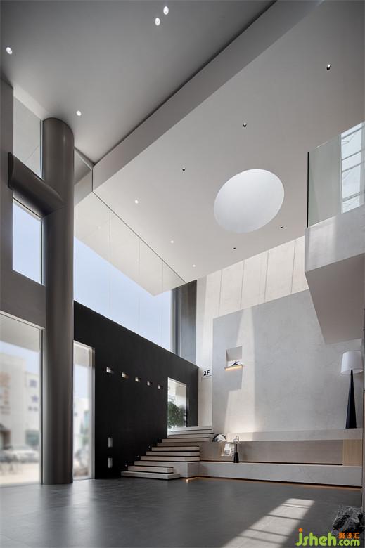 瓷磚場所,以光為引,通過挑空為上下層注入互動,瓷磚展廳設(shè)計打造“藝術(shù)品”般的空間。建筑立面以深灰打底,呈現(xiàn)了優(yōu)雅沉靜的氣質(zhì),幾何體塊碰撞,建筑仿若凝固的時空,泛著銀光的柱體貫穿上下,把光感過渡給三塊框景區(qū),以視覺觀感豐富建筑立面特征。