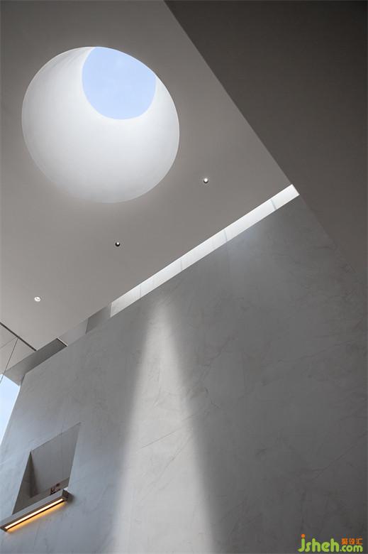 把建筑本身看作一個盒子,入口左側(cè)將光集中于上部,下部陰影自然倒映,瓷磚展廳設(shè)計既平衡著室內(nèi)溫度,又給予光更直接的敘事表現(xiàn)力。打通建筑與天地的聯(lián)結(jié),運用天井捕捉藍(lán)天白云,制造光束投射而入的氛圍。