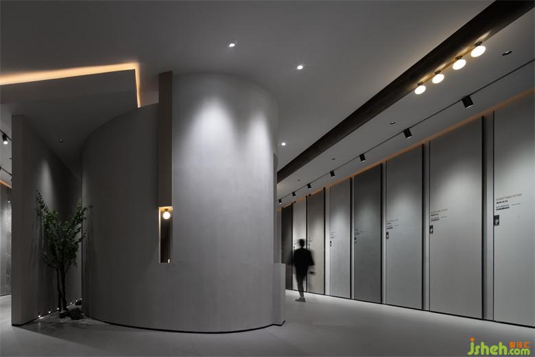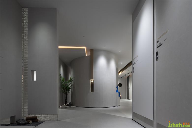 安東尼奧·高迪說(shuō)過(guò):“直線屬于人類(lèi),曲線則屬于上帝?!毖刂^(guò)道展陳優(yōu)質(zhì)的產(chǎn)品,瓷磚展廳設(shè)計(jì)通過(guò)過(guò)道盡頭的曲面裝置進(jìn)行導(dǎo)流,營(yíng)造出逛藝術(shù)畫(huà)廊一般的體驗(yàn)。設(shè)計(jì),在開(kāi)放與回歸、自然與封閉的概念和體驗(yàn)中游弋,給來(lái)者留下了深刻的印象。