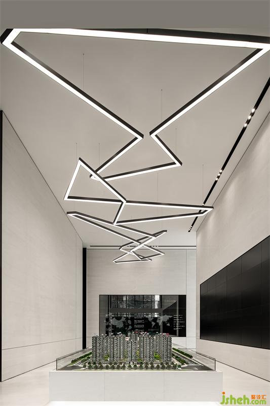 “穿梭的線條,是能量的光束,充滿了力量感?!钡鯚粼诤唵味旨兇獾目臻g中形成棱角明朗的符號,慈溪售樓部設計穿梭在沙盤上空的線條,呈現(xiàn)出極強的張力和沖擊力,各自重組的線條,宛如三棱鏡即將折射出絢爛光束前的沉靜,在這里,我們可以感知時間和空間,指引著我們情不自禁地向里探尋。