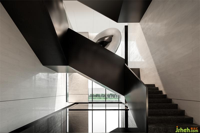 樓梯間我們利用水景與懸浮藝術裝置相結(jié)合,將端莊嚴肅的樓梯結(jié)構(gòu)趣味化,巨大的金屬球優(yōu)雅的漂浮在空中,賦予了空間以力量感,如同海面濺起的水珠,溫軟,感性,水珠映照著周邊的環(huán)境,平衡著樓梯間的節(jié)奏。