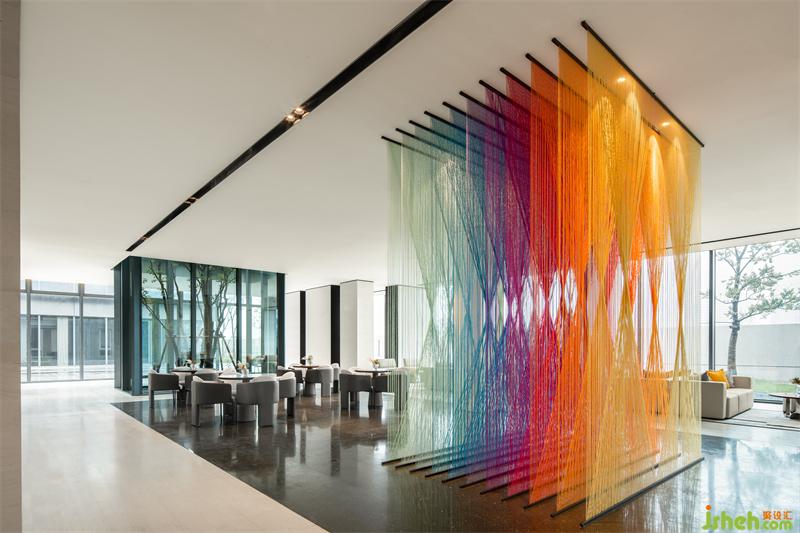 洽談區(qū)是空間故事的重心,也是折射出最絢爛光線的聚焦地。絲線的材質(zhì)和燈光的結(jié)合,展現(xiàn)出光和色彩的全新體驗,細膩的線猶如光束匯聚。在空間里非??侦`且具有感知力;極具張力的色彩打破空間的寧靜,彩虹般的色彩吸引著所有人的視覺焦點。