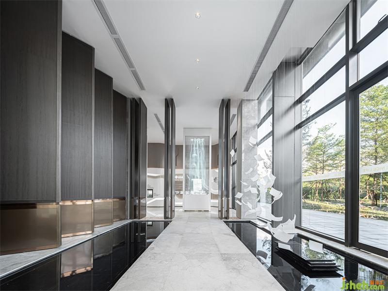 售樓部設計中入門空間用于調動參觀者的情緒,極具構成感的形式,強化了空間的節(jié)奏,選擇關聯(lián)的元素和形態(tài)上的優(yōu)雅,感受純粹的力量?;没療o窮的“水”形態(tài),被線條感,抽象化的自然美學形態(tài)呈現(xiàn)在了空間中。