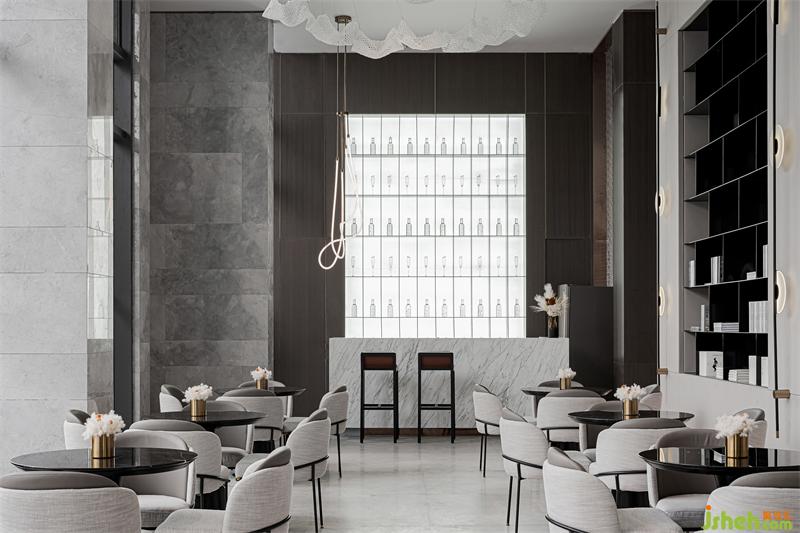 洽談區(qū)是空間故事的中心。整面開敞的落地玻璃窗,將室內與外部的自然環(huán)境毫無保留地銜接在一起,一直延伸到水吧臺。自然生長、流動,并與人產生關聯(lián),成為了這一空間考量的核心。水吧臺上空“浪花”裝置起舞浮游在空間中,在光影的變換下,呈現(xiàn)不同的樣貌。