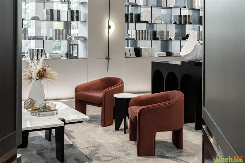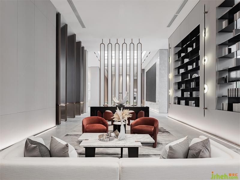 在開敞的空間形成段落兜轉(zhuǎn),通過兩側(cè)不同的光影、明暗的過濾,傾瀉于此的自然光更顯時(shí)光的分量。光影錯(cuò)落有致,沙發(fā)組凸顯質(zhì)感品質(zhì),點(diǎn)綴紅色洽談椅用來平衡空間的重量,它或深沉或內(nèi)斂,衍生功能的秩序,空間在低吟淺誦中建立微妙的靜態(tài)平衡。