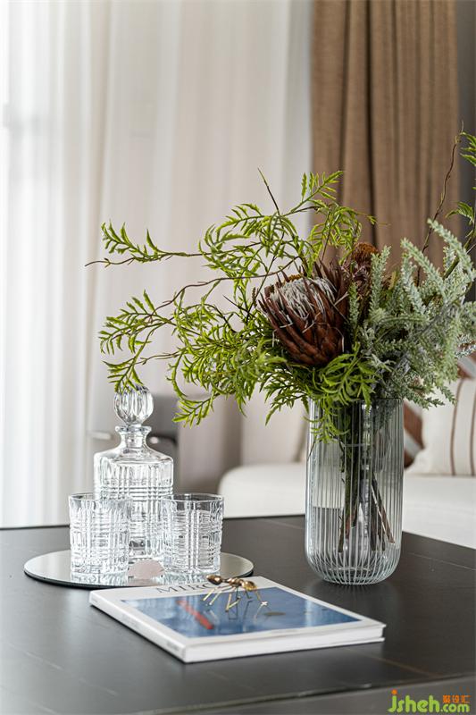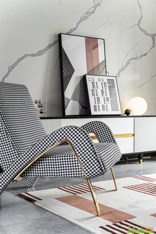 樣板房設計契合背景墻的米色沙發(fā)自帶高級氣場,配合黑白格紋加金屬單人椅,幾何造型打破黑色大理石茶幾的冷冽感,表達溫馨和藝術氛圍。紋路清晰的玻璃器具與跳脫的金屬擺件相碰撞,裝點空間的同時,形成強有力的視覺沖擊。