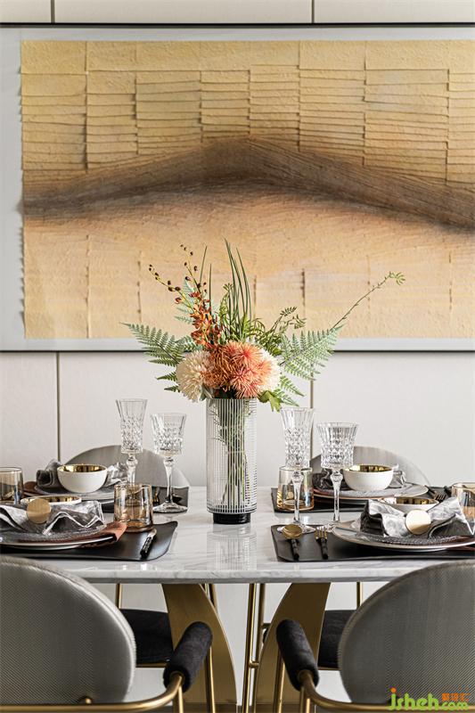 典雅的高級灰調中加入體現(xiàn)都市輕奢感的水晶和金屬色作為點綴,空間追求品質,舒適與放松的氛圍,材質與植物綠色的自然氣息,更得以體現(xiàn)放松,愜意的現(xiàn)代生活方式。我們對細節(jié)的考量貫穿著空間的始終,每一件珍藏都儀式感滿滿,讓就餐成為空間畫面中美好的情緒所在。