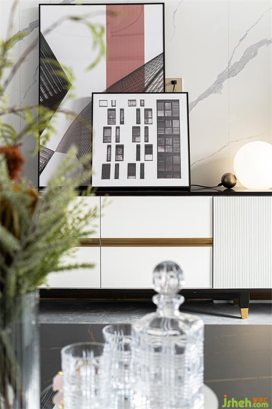 走進B1戶型這個空間,盡管高級灰、大理石、米白色,潔凈卻略顯清冷,但暖橘色的加入為空間注入了活力與溫馨,配合墻面裝飾畫維持了空間的視覺平衡