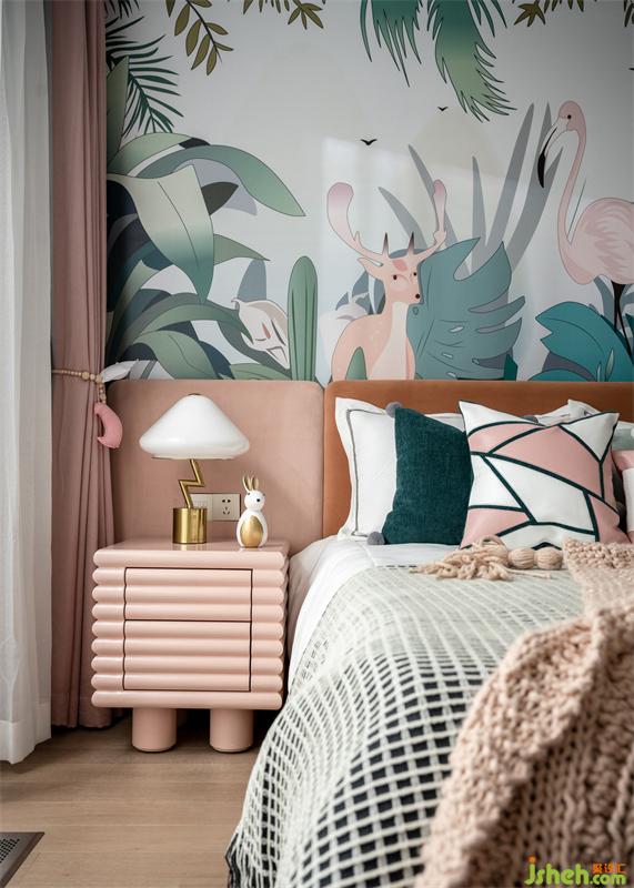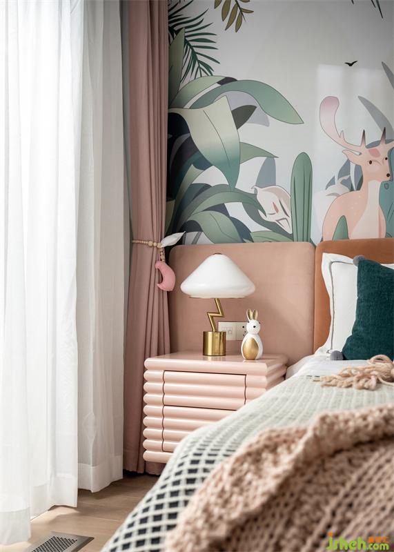 女孩房仿若走進(jìn)鳥語花香的叢林,是對童趣的解讀與純粹自然生態(tài)相結(jié)合,圍繞叢林小公主展開童夢空間,構(gòu)成小主人與大自然的親密互動場景。