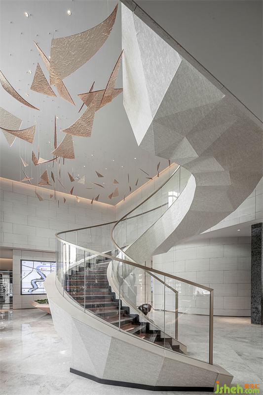 對于空間融入氛圍的藝術裝置一直是設計中加法的呈現(xiàn),“月亮碎片”藝術造型的融入,似標點、似水滴、似科技光點、似宇宙星垂,帶著專屬的顏色,刻度和肌理,透過開闊明亮的空間展陳,賦予空間以靈動的活力,與切割元素造型堆砌而成的旋轉(zhuǎn)樓梯相互銜接,打破了藝術矩陣的邊界,讓空間的趣味性和探索性恰到好處。