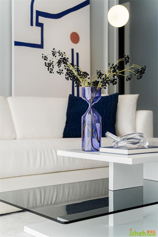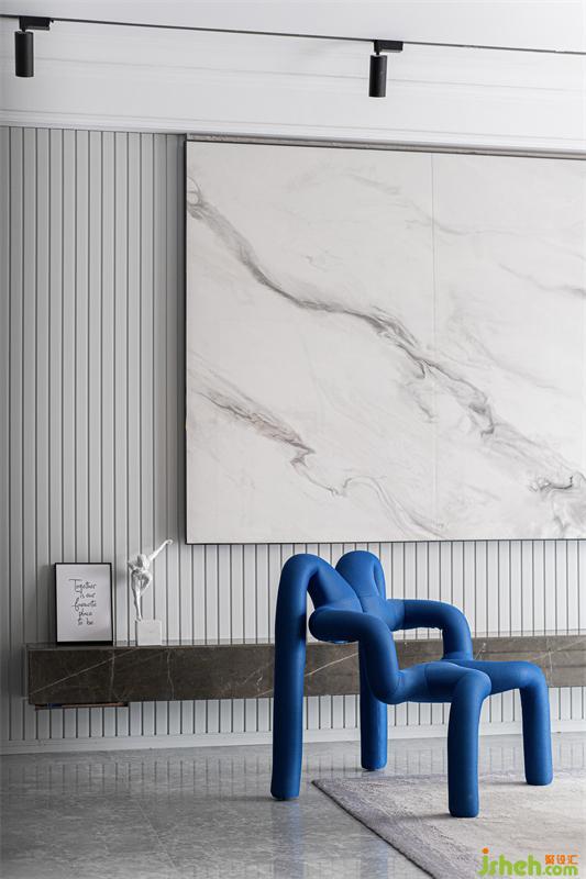 整個空間的色彩材質(zhì)以高級灰結(jié)合局部藍色點綴為主,家具運用高級面料布藝,與大理石金屬等材質(zhì)的碰撞,提升空間品質(zhì)與層次,藍色所表現(xiàn)的沉穩(wěn)冷靜,體現(xiàn)居家的精致氛圍,讓整體空間更具藝術(shù)性。