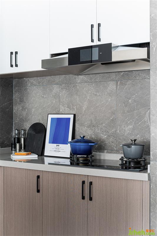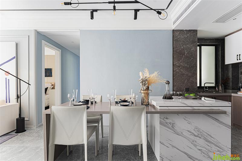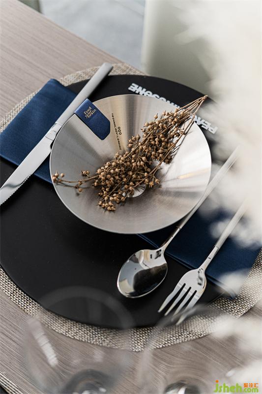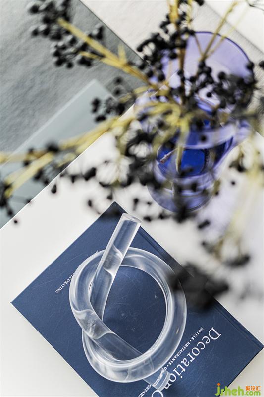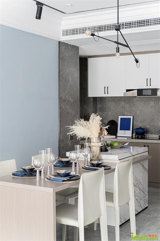 視覺點落在餐廳空間的每一個角落,餐椅整體造型簡潔干凈,精致的藍色系餐具的融入,為此空間增添了些許生活氣息,繁忙工作也要好好享受生活,閑暇之余,煮一杯咖啡或自己調(diào)一杯小酒,都是極好的享受。