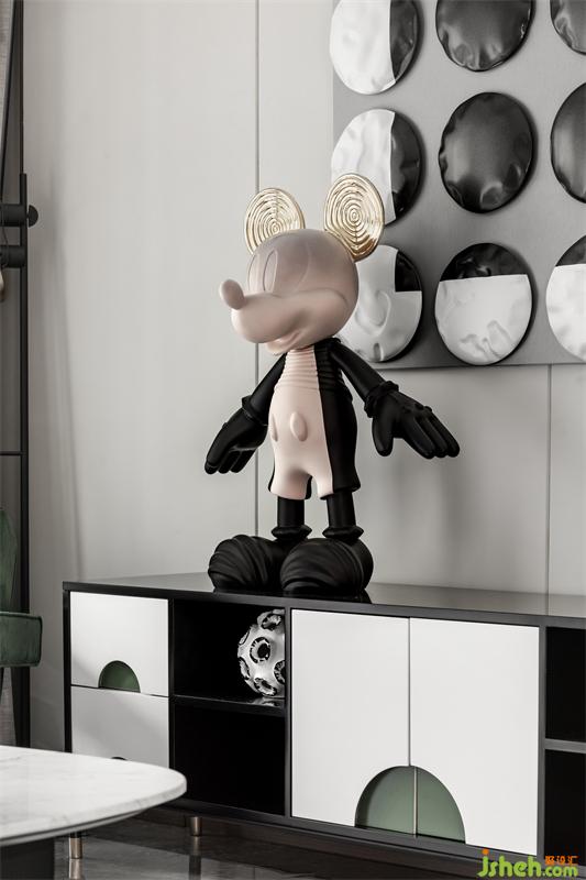 C戶型從入戶玄關(guān)到客餐廳、臥室及陽臺,一系列的空間中不斷出現(xiàn)米奇元素,為了在空間里添加足夠的記憶點(diǎn),局部我們也運(yùn)用了黑白色系的波點(diǎn)做為點(diǎn)綴,讓空間充滿活潑與趣味性。