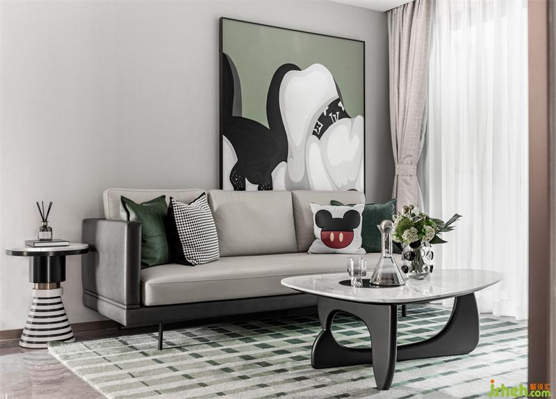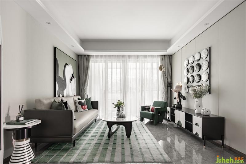 樣板房設(shè)計(jì)以黑白灰為大面積襯托色,復(fù)古綠為點(diǎn)綴色,少部分運(yùn)用金色拉開空間的層次感,適當(dāng)運(yùn)用復(fù)古綠延續(xù)到其他空間,色彩就像是一幅畫,是畫更是悠然愜意的生活方式。