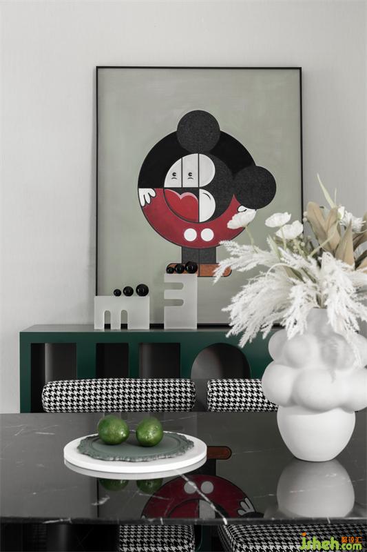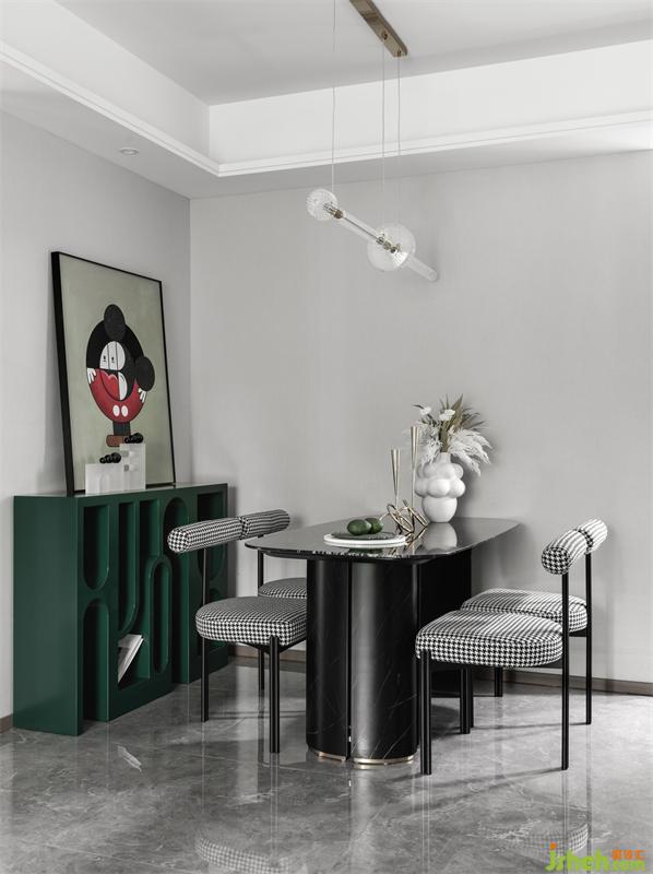 進(jìn)入客廳,空間帶給我們的第一感覺是綠意的明快清新,柔軟的綠色單人椅,米色與黑色搭配的皮質(zhì)沙發(fā),局部點(diǎn)綴紅色,與俏皮的裝飾掛畫相呼應(yīng),充分展示著自然的氣息。綠色延伸到餐廳的局部,一副綠調(diào)抽象拼接畫建立起餐廳的藝術(shù)情調(diào),黑白相間的格子布藝餐椅平衡著空間的屬性。