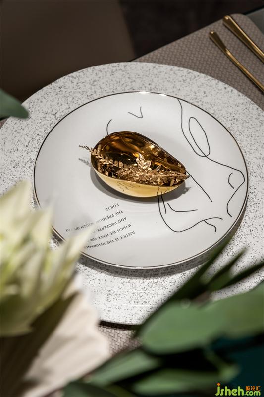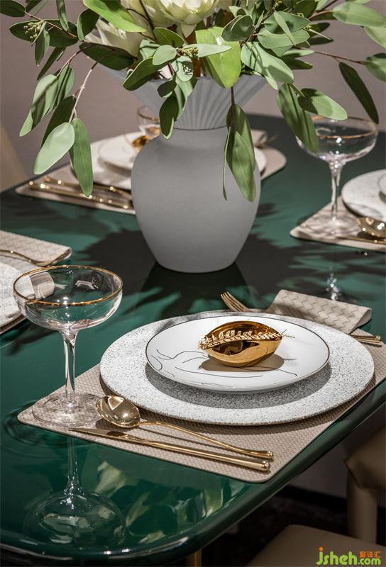 我們利用空間本身的格局,對餐廳進行了簡約化設(shè)計。米色馬鞍皮餐椅與綠色的餐桌搭配,輕巧靈動,從灰色背景中跳躍出來,塑造出清爽素雅又靜謐浪漫的格調(diào),再搭配綠色花藝,使得原本有限的空間充滿自然氣息。