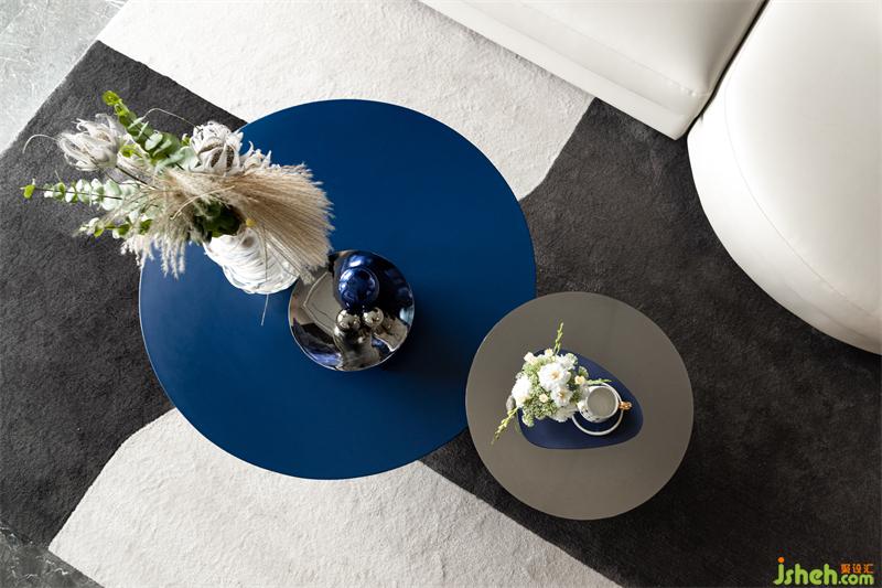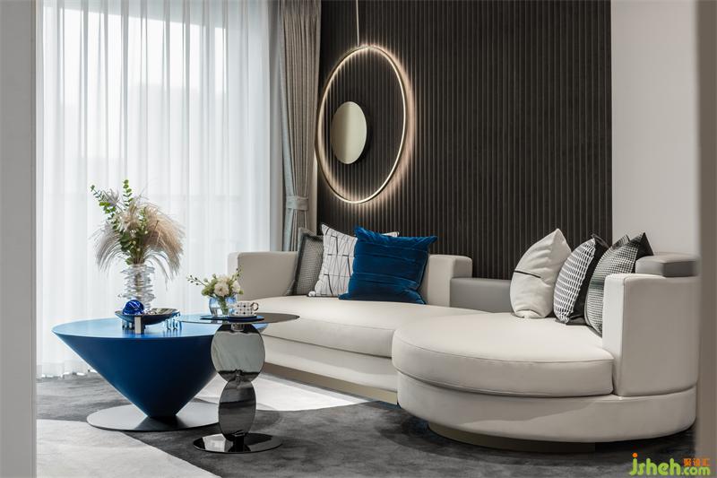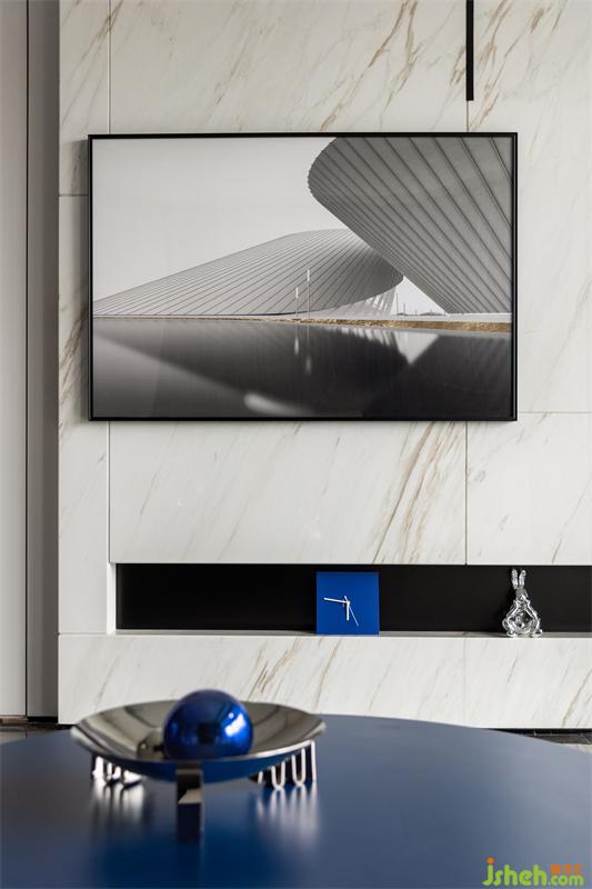 寧靜之藍(lán),生活之味,個性的藍(lán)將客餐廳一體貫通,空間瞬間流動起來,映襯著藍(lán)色的個性茶幾,黑色簡潔的沙發(fā)背景墻也與幾何裝飾的墻飾冷暖互補,強(qiáng)調(diào)了空間的秩序感和節(jié)奏感。