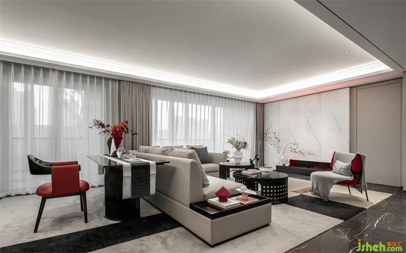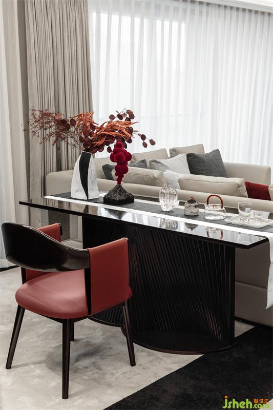 休閑愜意是居住空間的基調(diào),忙碌之余,和家人在此交流、放松,感受生活的樂趣,同時(shí)也可接待親朋好友,這里是連接家人之間親情和朋友感情的紐帶??臻g以淺色為色彩主基調(diào),點(diǎn)綴金屬色,暗紅色,以現(xiàn)代的手法融入中式元素,又不乏端莊的儀式感。
