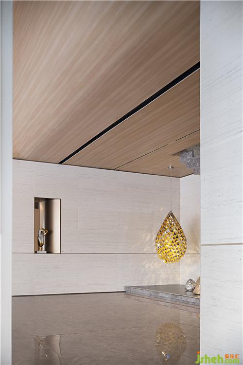 經(jīng)過(guò)了曲形飛幕,進(jìn)入到偌大的挑空處,大面積的實(shí)木天花和木紋石墻,造型簡(jiǎn)潔以合理的工藝構(gòu)成,配以素雅的灰色瓷磚地面,共同勾勒出空間基礎(chǔ)底色。